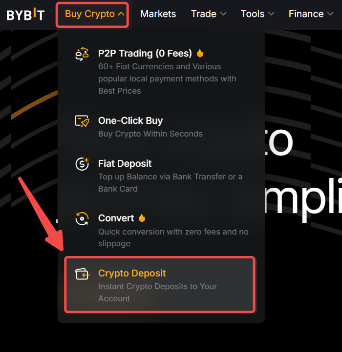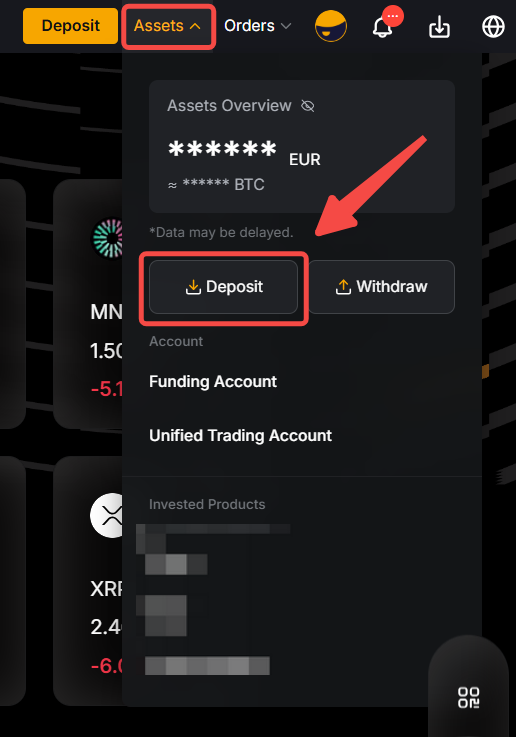 或者,您也可以將遊標停留在 Bybit 首頁右上角的資產上。然後點擊儲值進入儲值頁面。