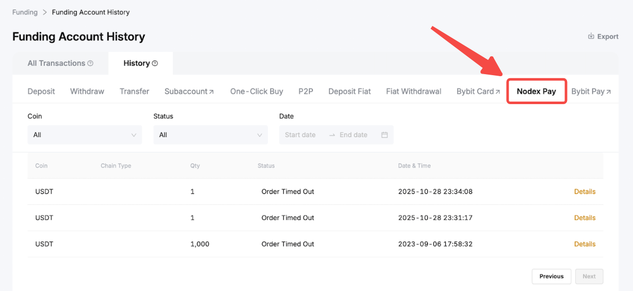 第 5 步:交易完成後,您可以在資金帳戶歷史記錄頁面查看訂單記錄。要僅查看 Nodex Pay 記錄,只需點擊Nodex Pay。