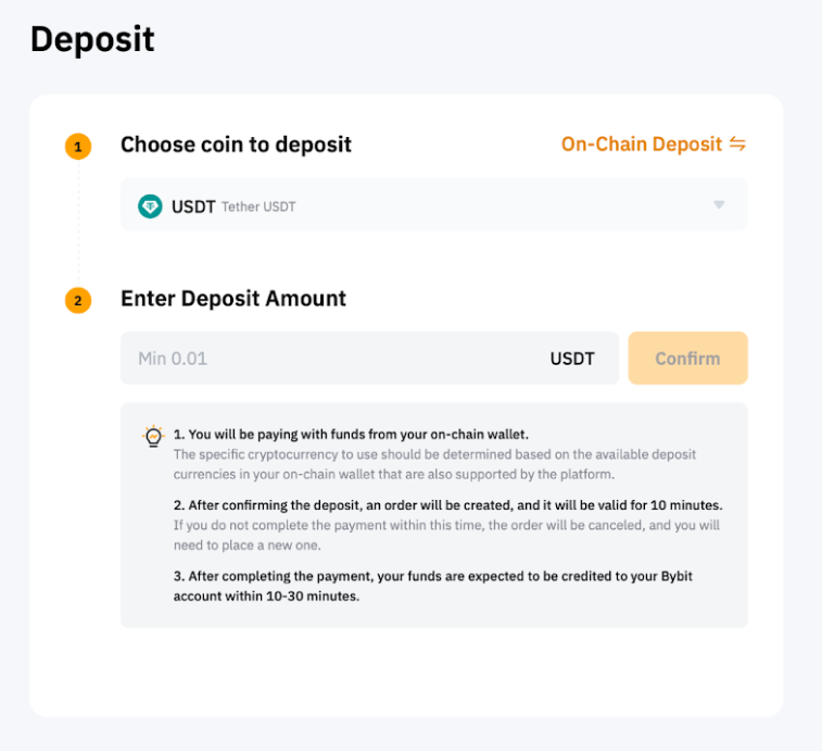 所有 Bybit 用戶均可透過 Nodex Pay 充值加密貨幣,可透過 ERC20、BSC 和 MATIC 網路充值 USDT。