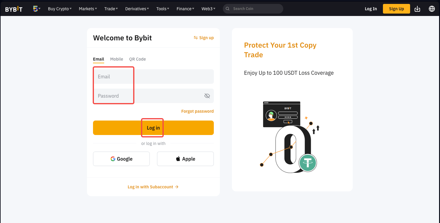 第 1 步: 前往 Bybit Web 或 App 登錄頁面,輸入已停用帳戶的憑據。 然後,點擊登錄。