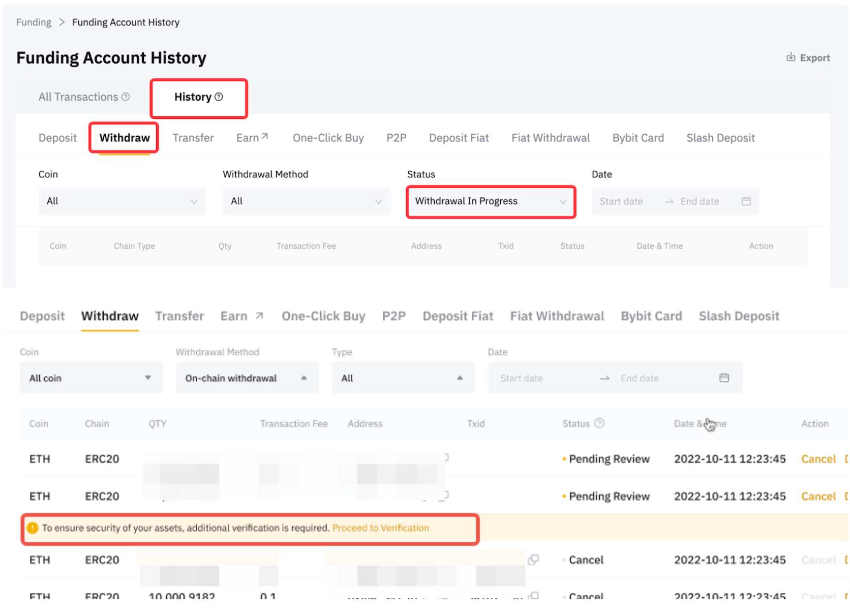 第 2 步:狀態篩選欄中選擇提幣處理中,查找帶有「為保障您的資產安全,該筆提現需完成額外驗證。前往驗證」字樣的訂單,然後點擊前往驗證