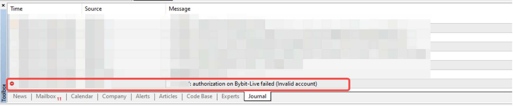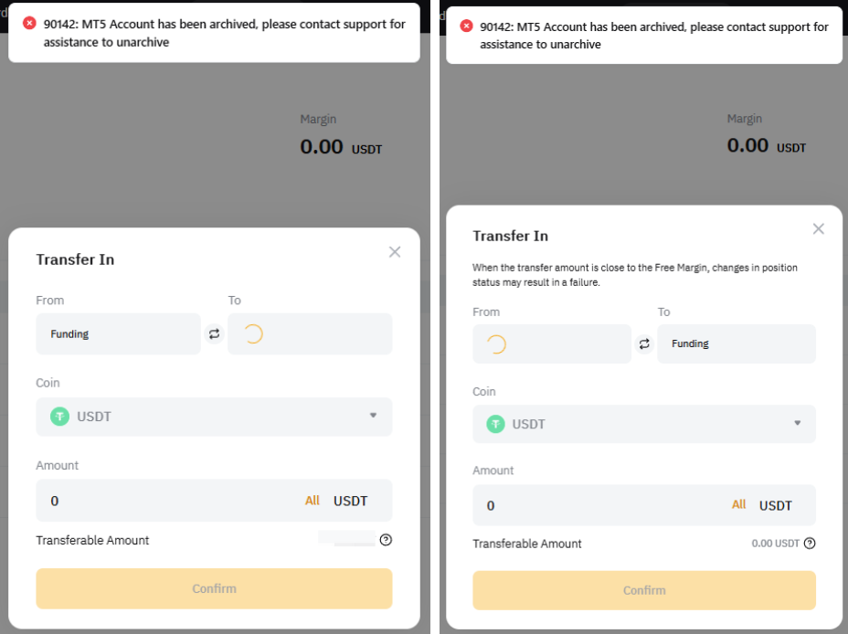 3. 嘗試將資金轉入和轉入 MT5 帳戶時,您會看到錯誤訊息。