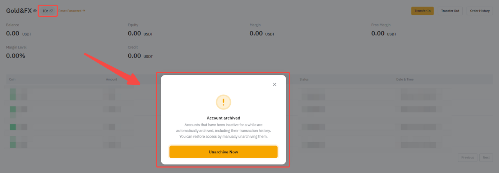前往Bybit MT5 資產頁面。系統將顯示一則彈出訊息,通知您帳戶已存檔。若要解鎖帳戶,請點擊立即解鎖按鈕。