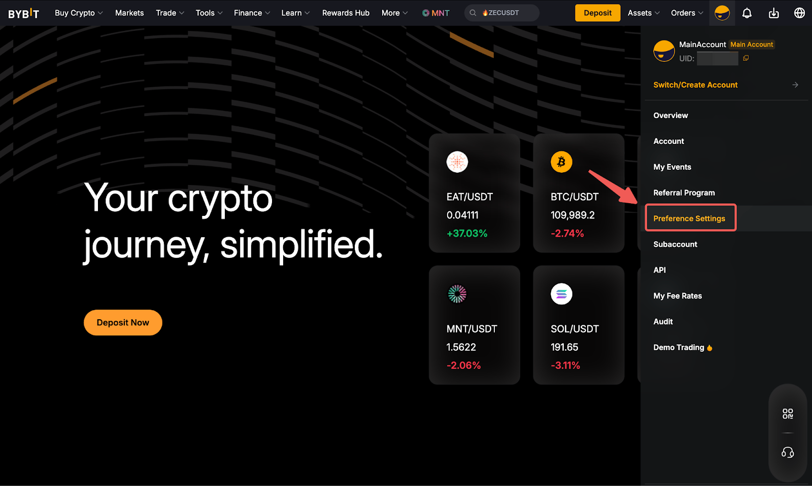 在「通用設置」選項卡中,選擇要在 Bybit 網站上顯示的首選貨幣。 該貨幣將用來估算您的資金和訂單金額,以更好地了解您賬戶的價值。