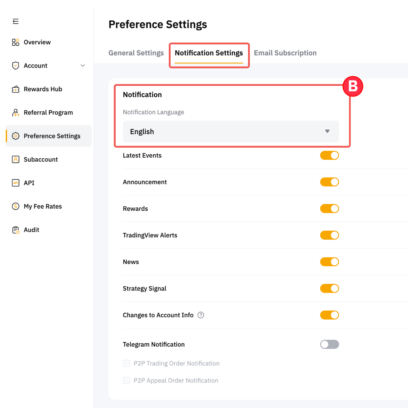 在「通知設置」選項卡的下拉菜單中選擇您的首選通知語言。 請注意,此語言設置僅適用於您收到的電子郵件通知。 要修改網站或彈出通知的語言,請參閱本指南