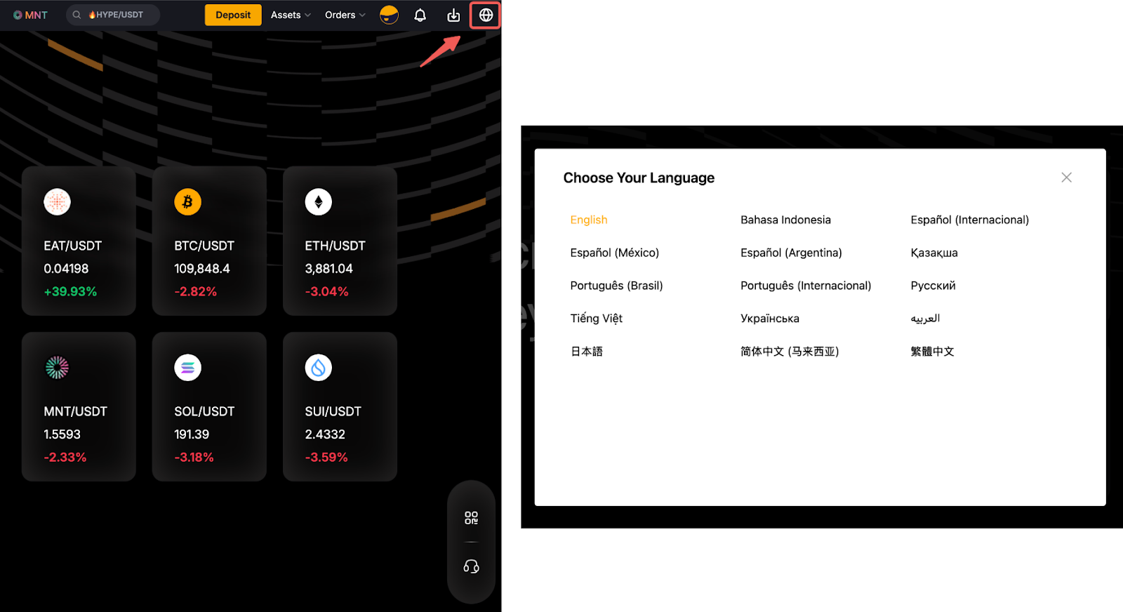在網站右上角,點擊地球圖標,打開可用語言列表並選擇您的首選語言。