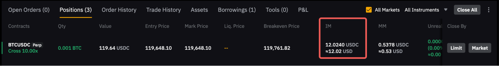 請注意,倉位選項卡中顯示的起始保證金包括 Taker 費,該費用可能會在平倉時產生。