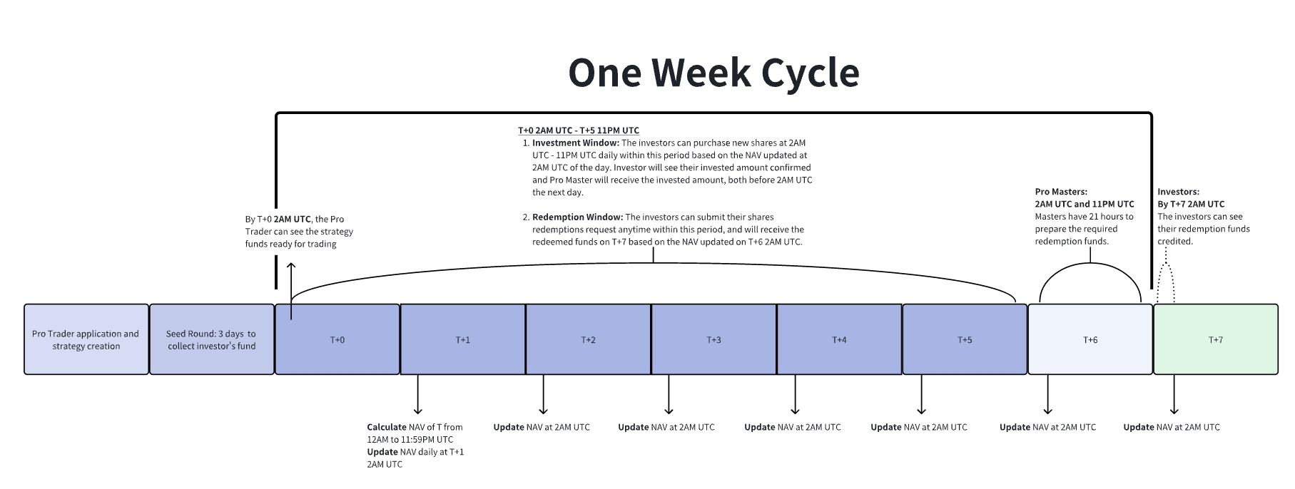 • 假設「T」落在週一:投資者可以在週一至週六的 UTC 凌晨 2 點至 UTC 晚上 11 點之間購買額外股份。若要贖回股份,投資人可以在週一 UTC 凌晨 2 點至週六 UTC 晚上 11 點之間隨時提交贖回請求。 Pro 達人會在周日整理所需的贖回資金,並在下週一之前將資金記入投資者的帳戶。