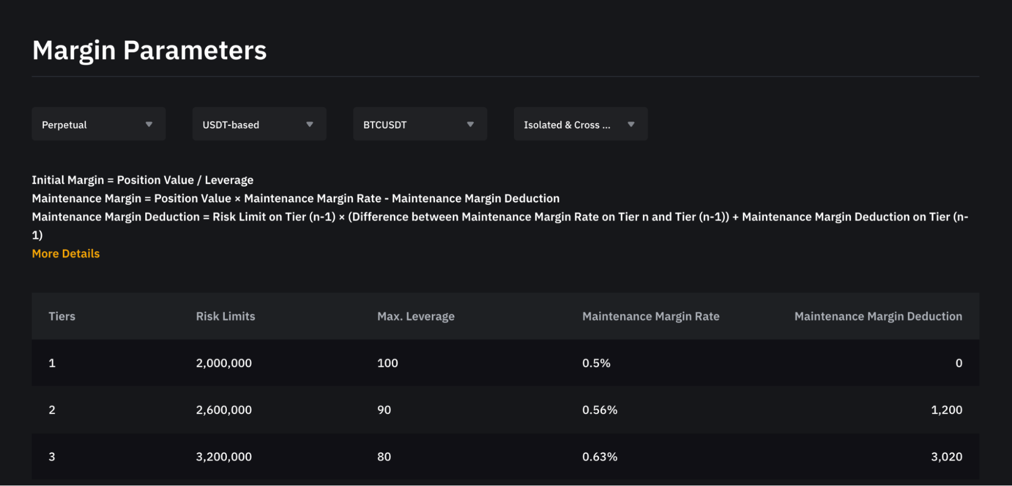 要查看所有交易對的風險限額資訊,請依次點擊合約資訊 → 衍生品交易規則保證金參數或訪問此頁面