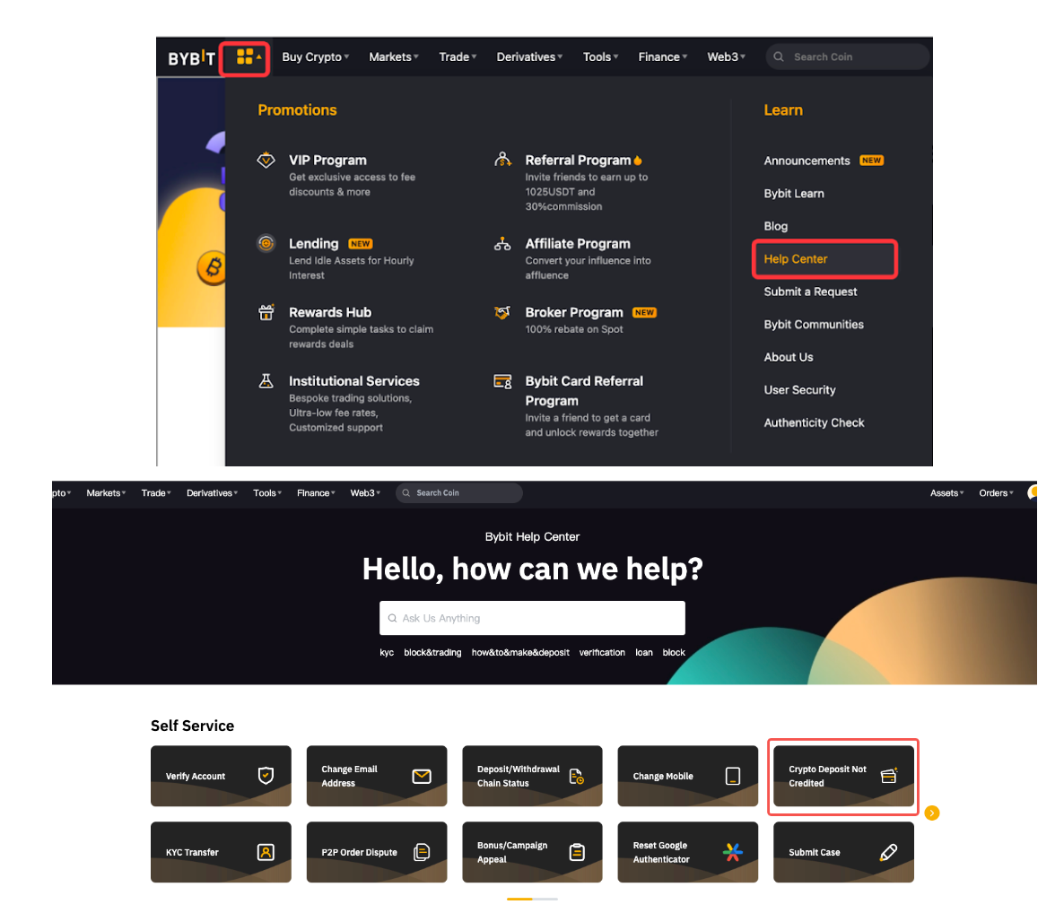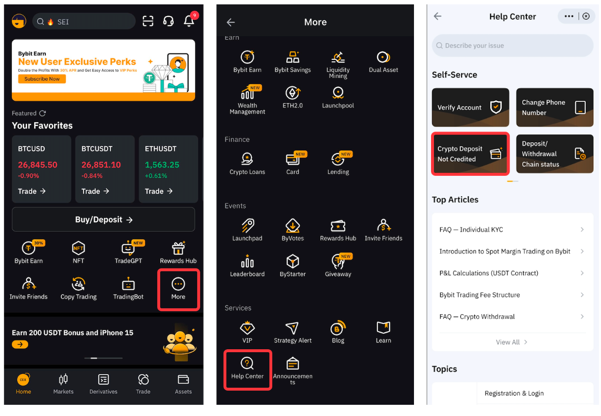 如果您使用Bybit 應用程序,請點擊首頁的 更多,然後點擊 幫助中心。