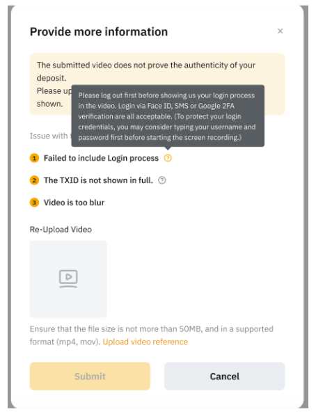 第 2 步: 系統將提示您重新提交包含所需資訊的影片。 將滑鼠移到問號圖示上時可以找到相應的解決方案。