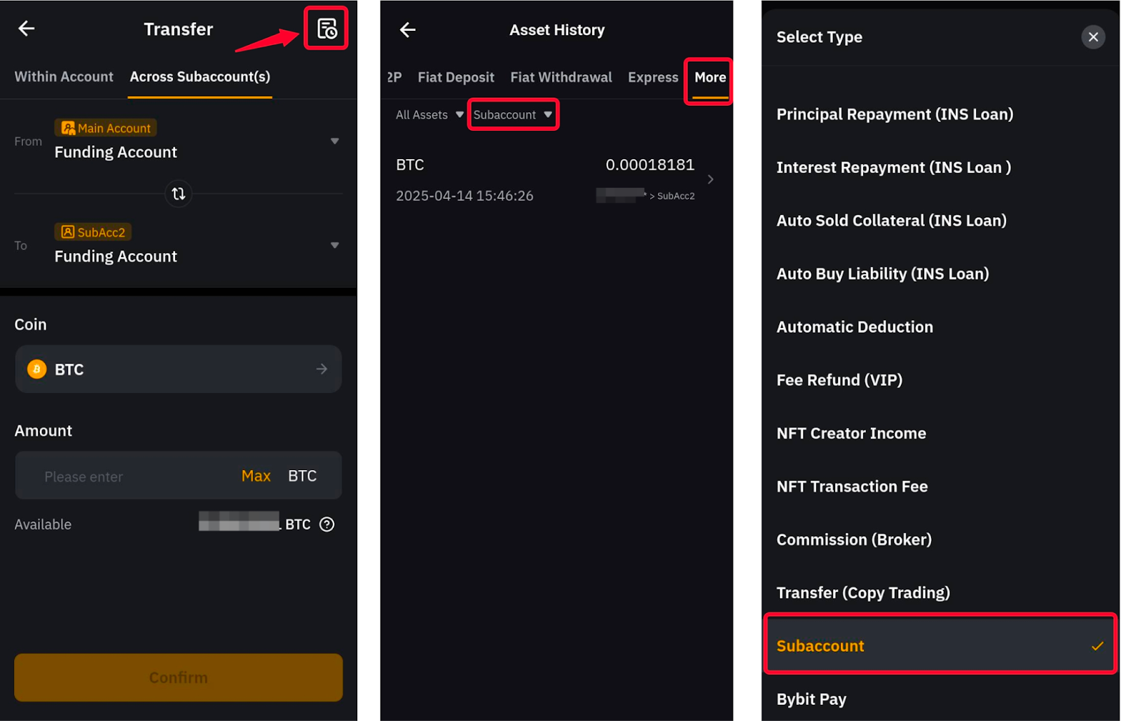 在轉帳視窗中,點選螢幕右上角的歷史圖示。轉帳選項卡將顯示您在主帳戶上進行的所有資金轉帳。若要查詢您的子帳戶轉帳記錄,請向右捲動,找到更多選項卡,然後在“選擇類型”選單中選擇子帳戶