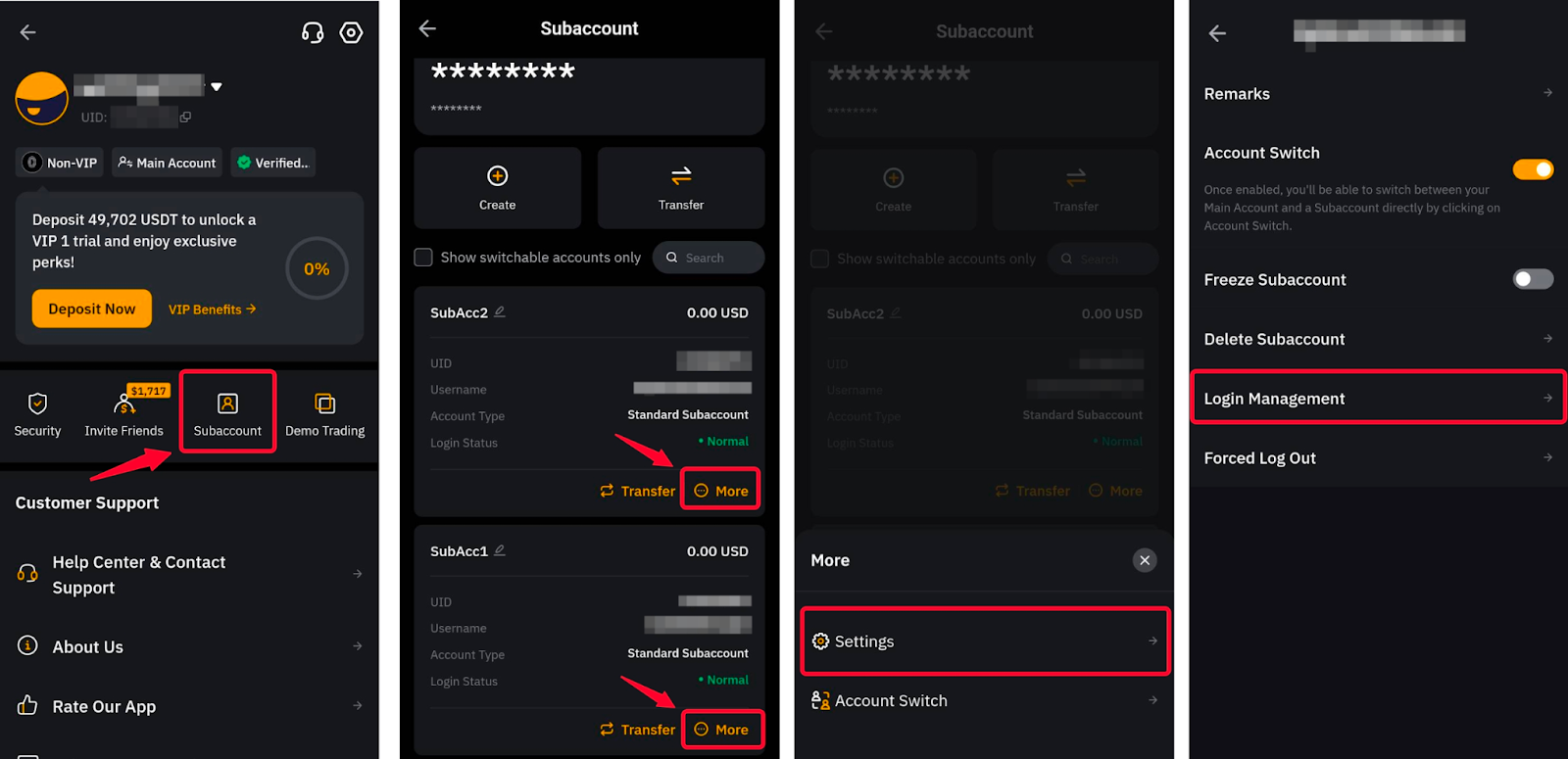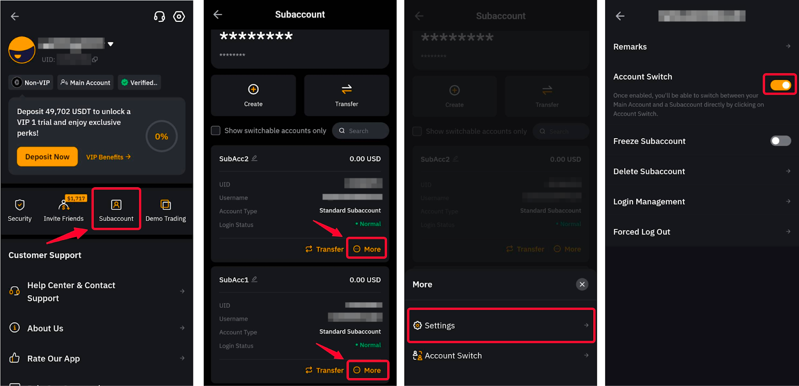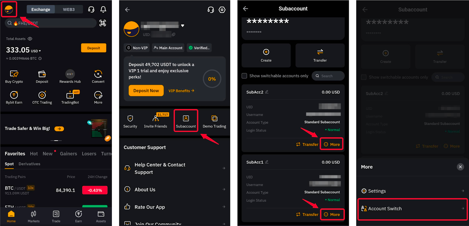 方法 3:點擊主頁左上角的個人資料圖片,開啟子帳號頁面。找到要開立的子帳戶,然後點選更多 → 帳戶切換,系統會自動將其記錄到所選子帳戶。