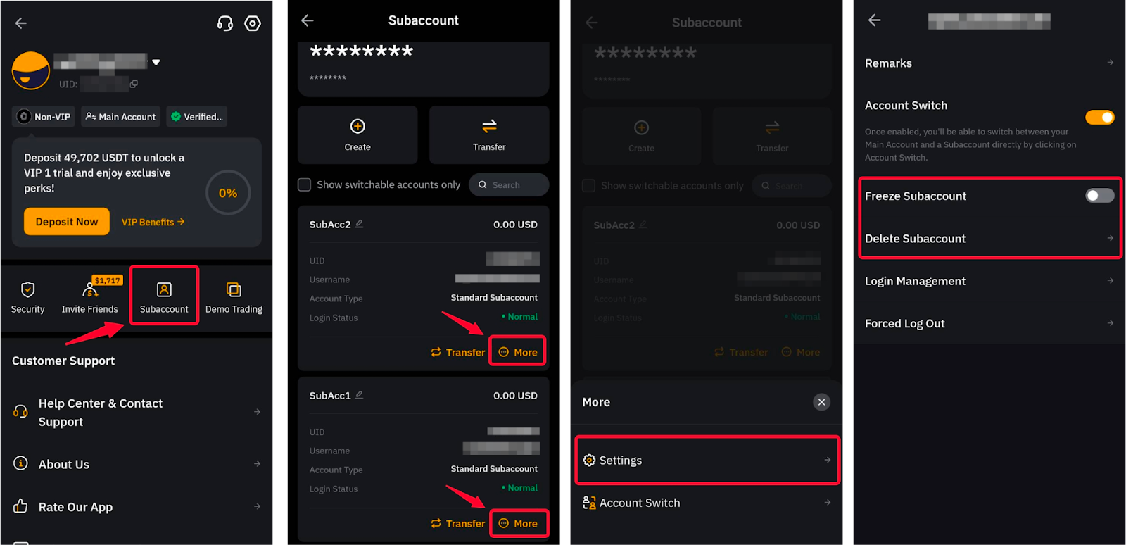 刪除/凍結子帳戶,您需要點擊左上角的個人資料圖片,開啟子帳戶標籤。點選相關子帳戶的更多按鈕,打開設定,然後點擊凍結子帳戶或刪除子帳戶