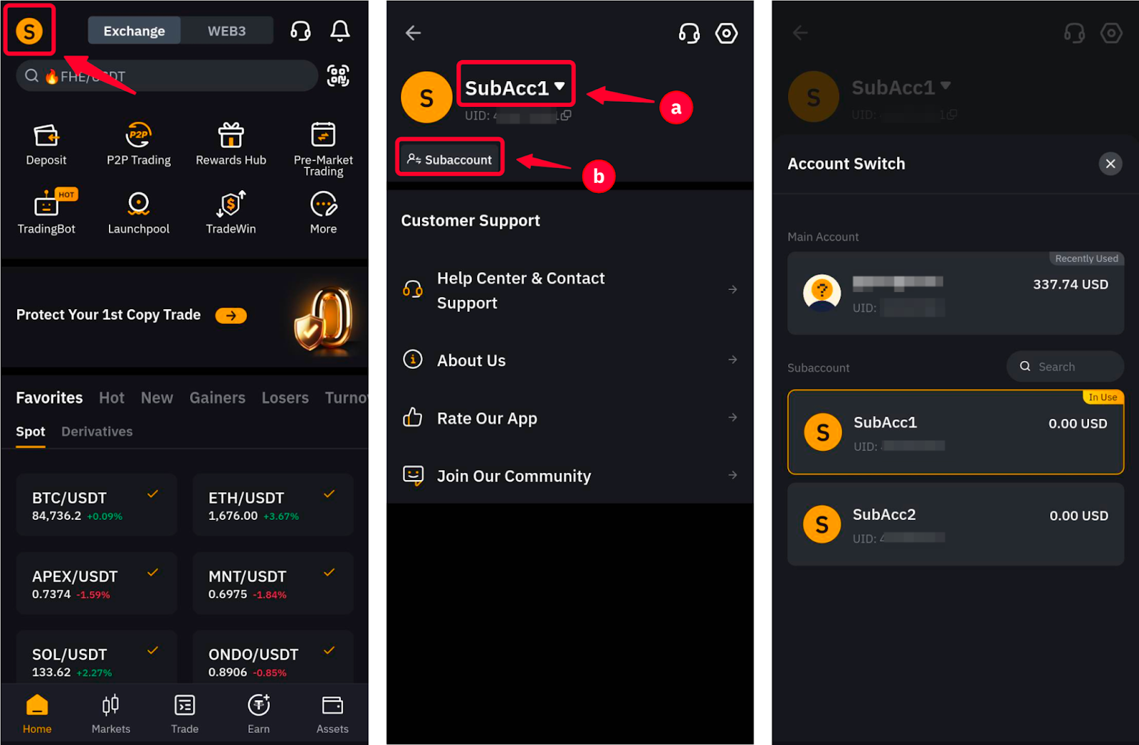 如果您透過帳戶切換登入,您可以點擊主頁上的個人資料圖片,然後點擊子帳戶暱稱 (a) 或子帳戶按鈕 (b)。此時將開啟帳戶切換選單,您可以在其中重新登入主帳戶或其他子帳戶。