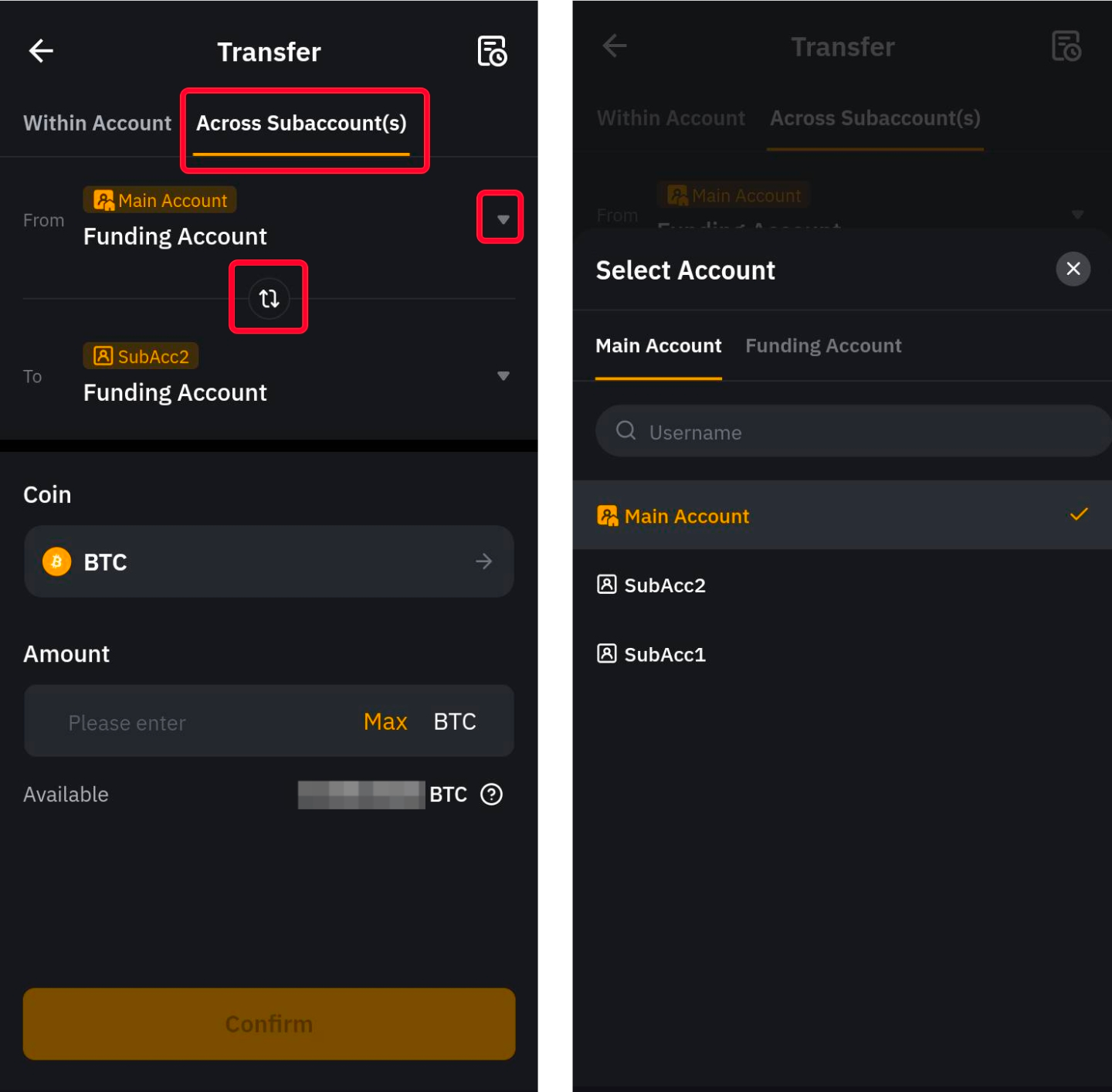 在主帳戶和子帳戶之間劃轉資產