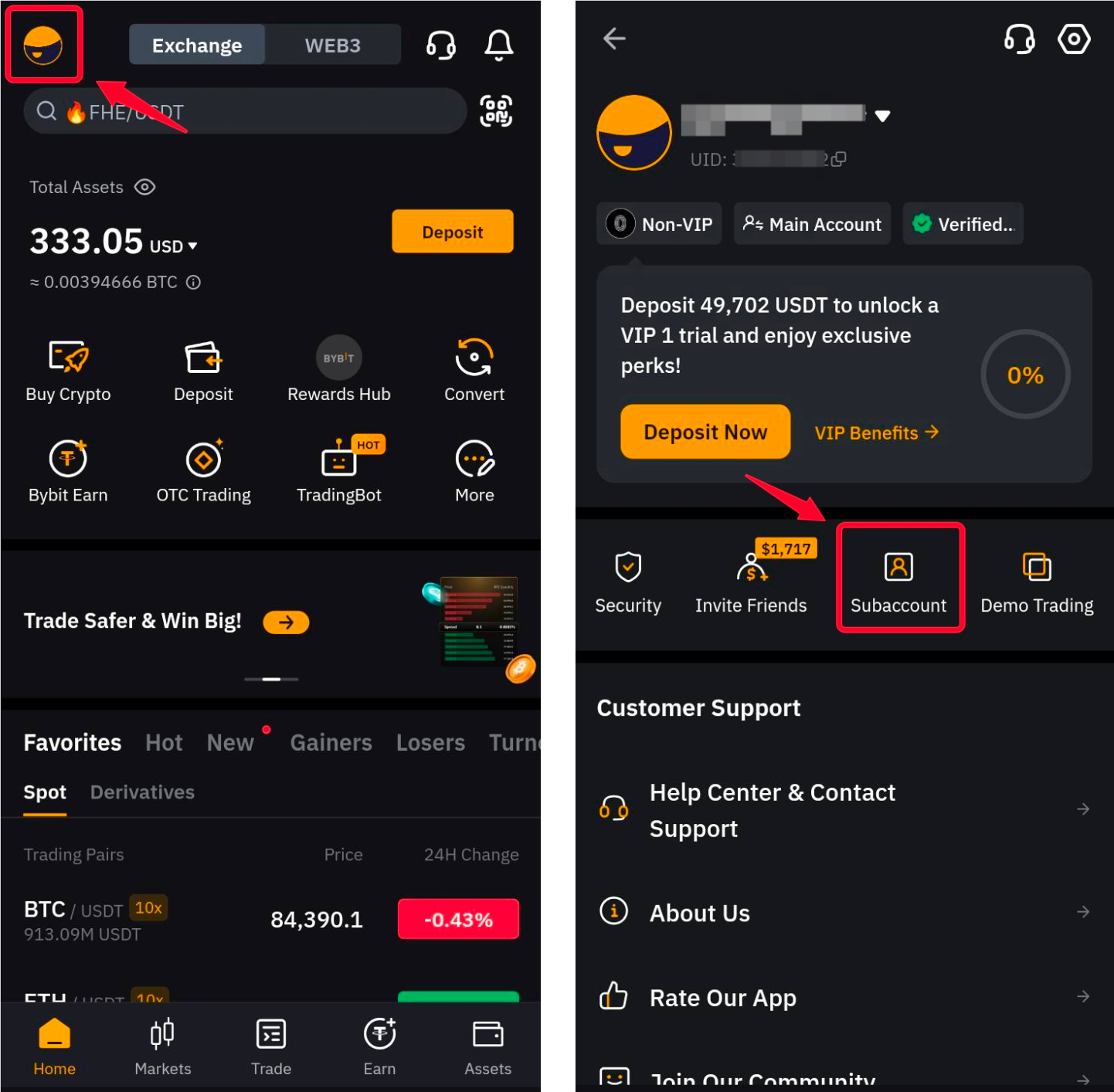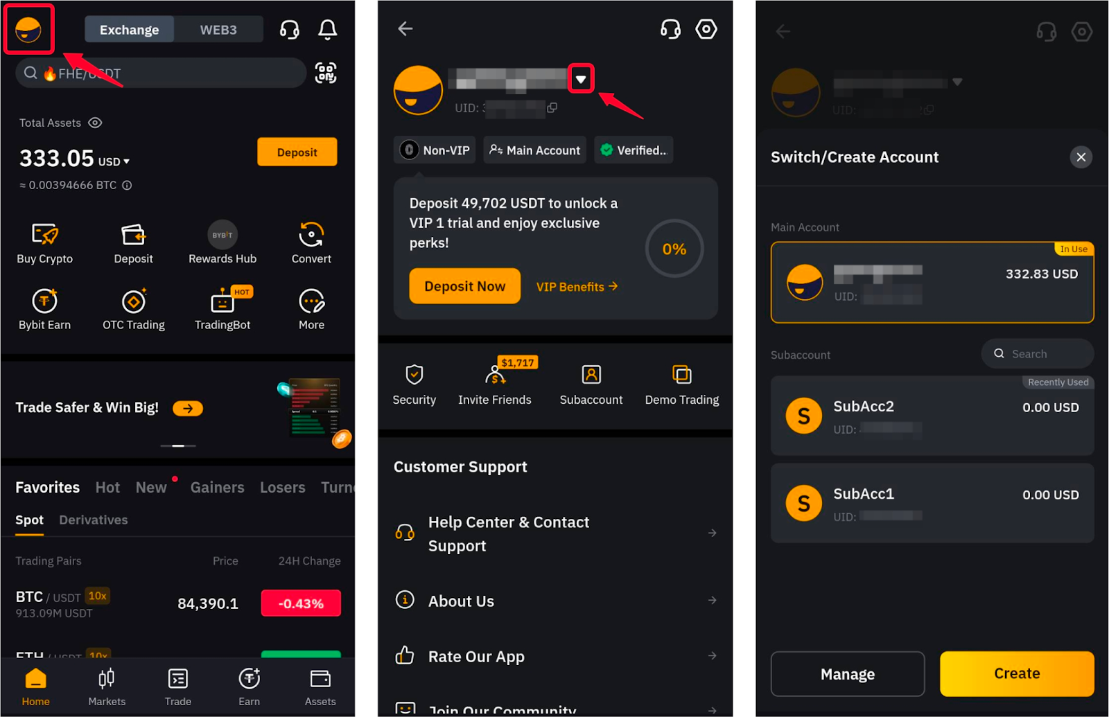 第 1 步:登入 Bybit App,點擊左上角的個人資料圖標,進入子帳戶選項卡。