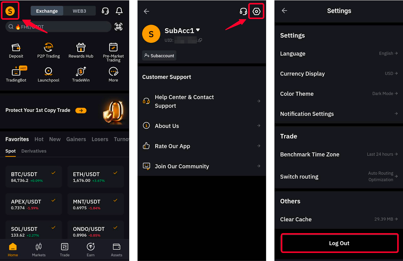 透過 Bybit 登入頁面登入後,您可以點擊主頁中的個人資料圖片,打開設定頁面,向下捲動到選單末尾,點擊註銷按鈕,退出子帳戶。