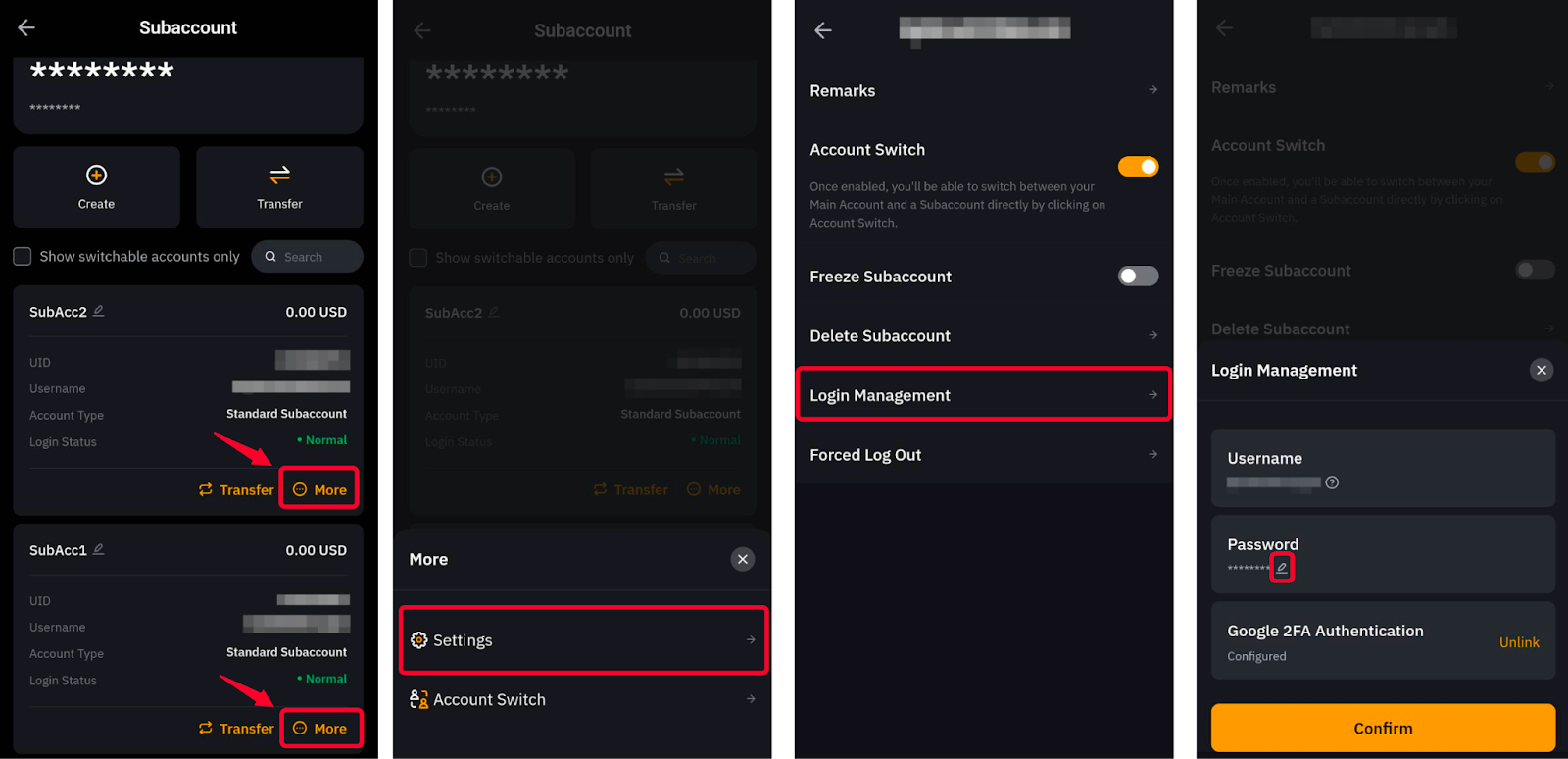 對於密碼更新,只需前往相關子帳戶,點選更多 → 設定 → 登入管理,然後點擊密碼旁邊的鉛筆圖標。系統會要求您輸入新密碼,並輸入主帳號的 2FA 驗證碼確認更新。