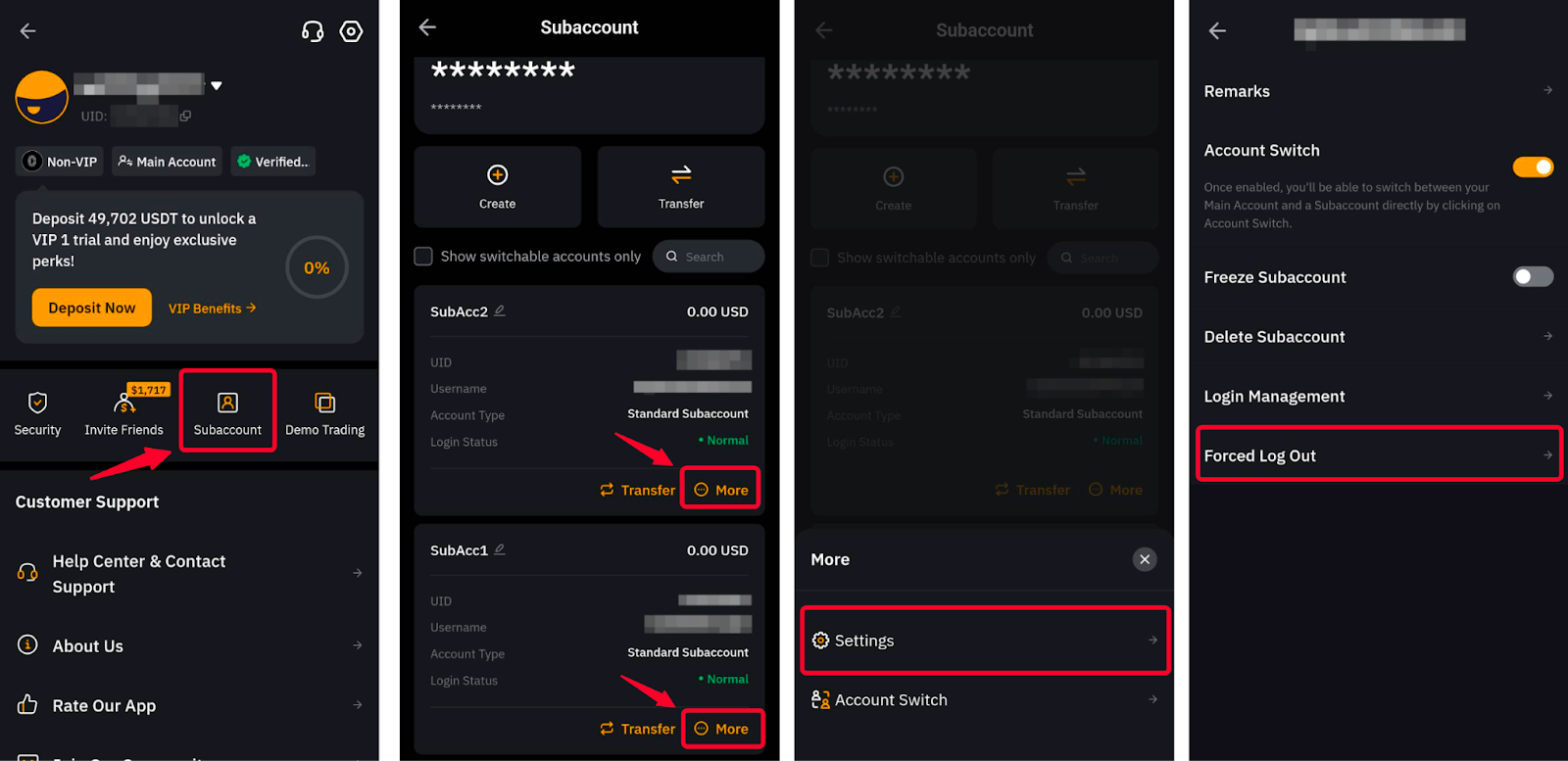 在主帳戶中,您也可以點擊更多 → 設定 → 強制註銷,使用每個子帳戶可用的強制註銷按鈕在其他裝置上登出子帳戶。